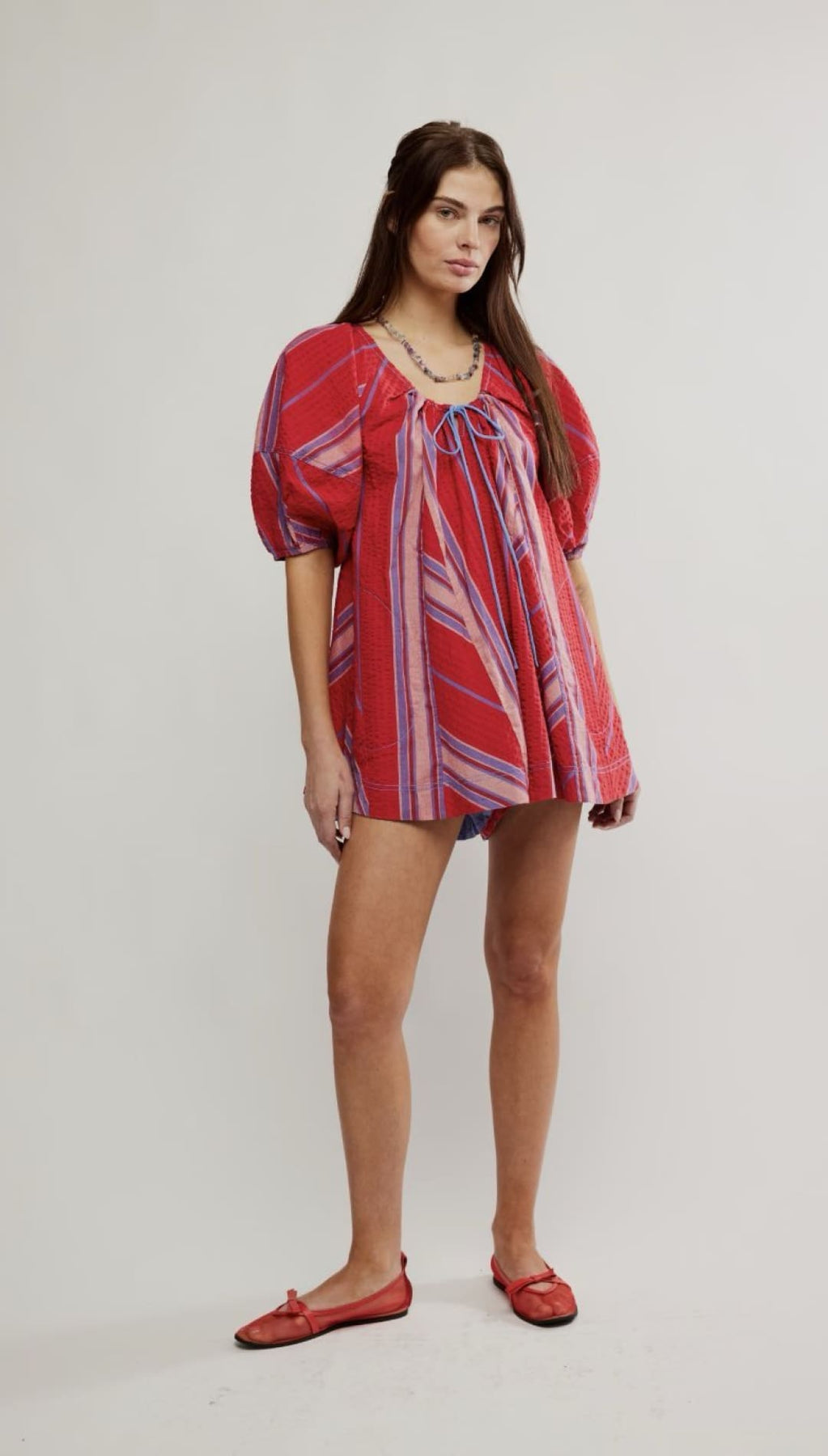 Get ready to bop around in our Bop Around Romper! This playful and stylish romper features bold red and blue stripes, perfect for adding a pop of color to your wardrobe. Complete with convenient pockets and adorable puffy short sleeves, this romper is designed for a fun and carefree day. Experience comfort and style in one with this romper!