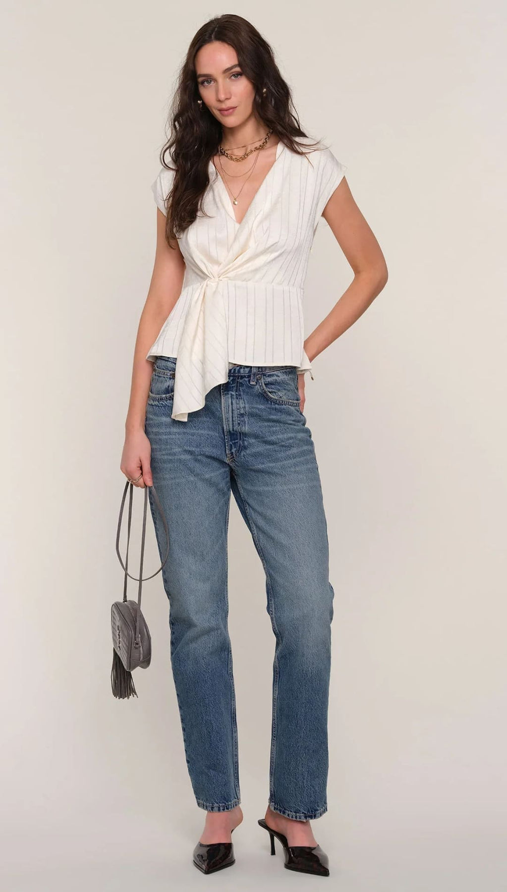 Women’s off-white pinstriped short-sleeve top with a V-neck and a front knot detail.