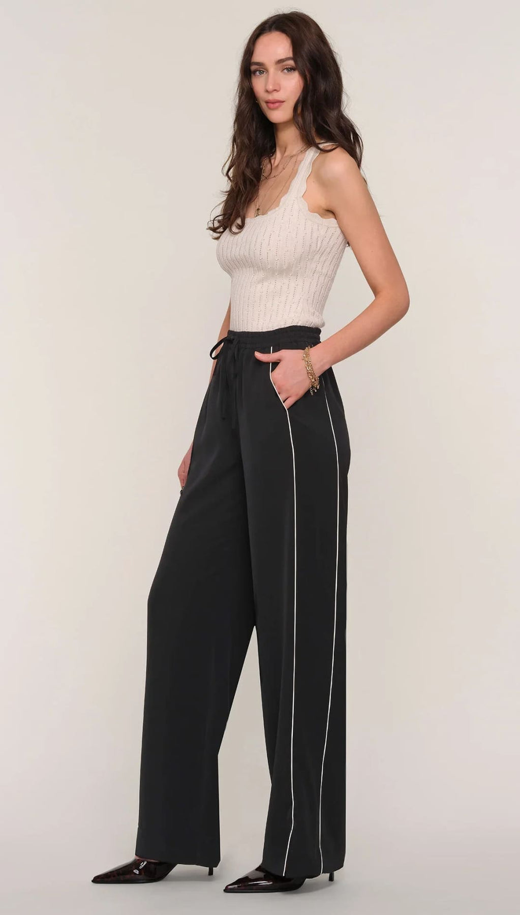 Unleash your divinity with the Devine Pant. These lightweight black pants, with a chic white stripe on the side, offer both style and comfort. The unique slit at the bottom adds a touch of edge, while the drawstring waist allows for the perfect fit.
