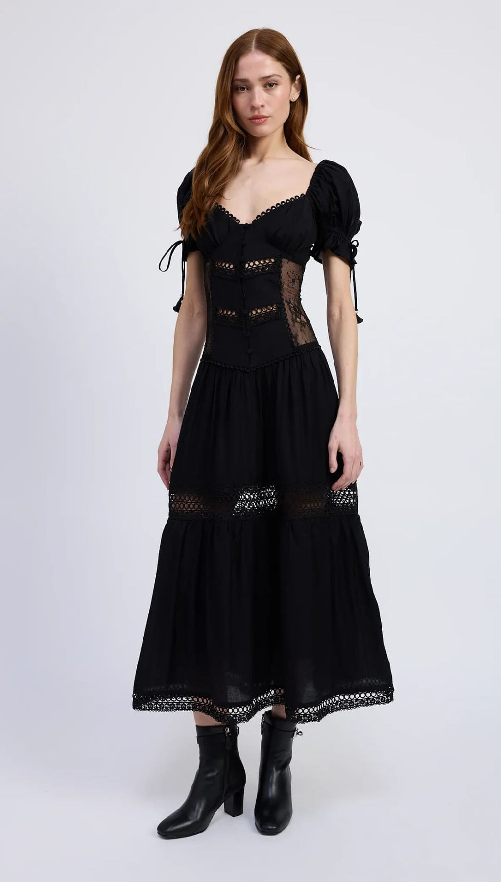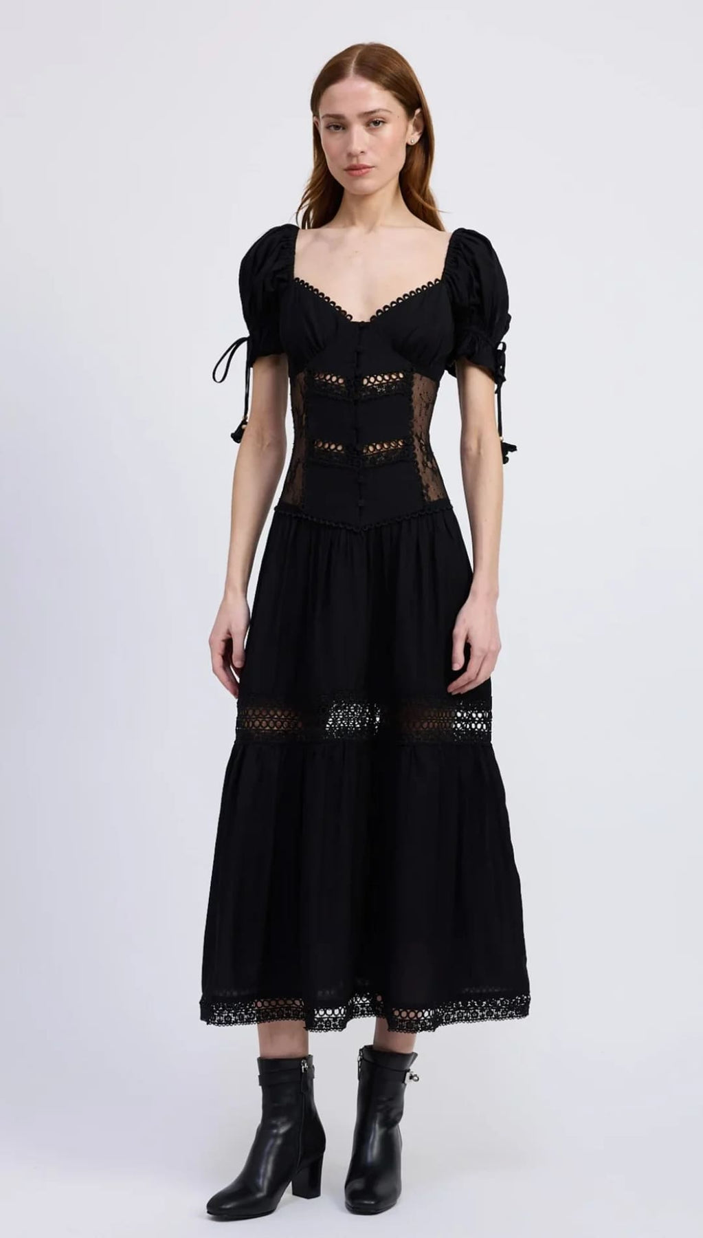 Women’s black midi dress with puffed sleeves and lace inserts.