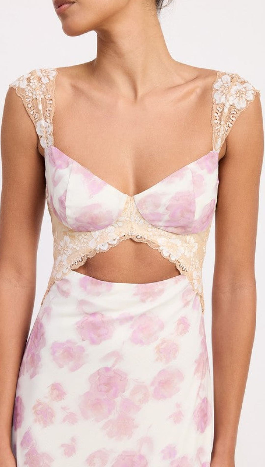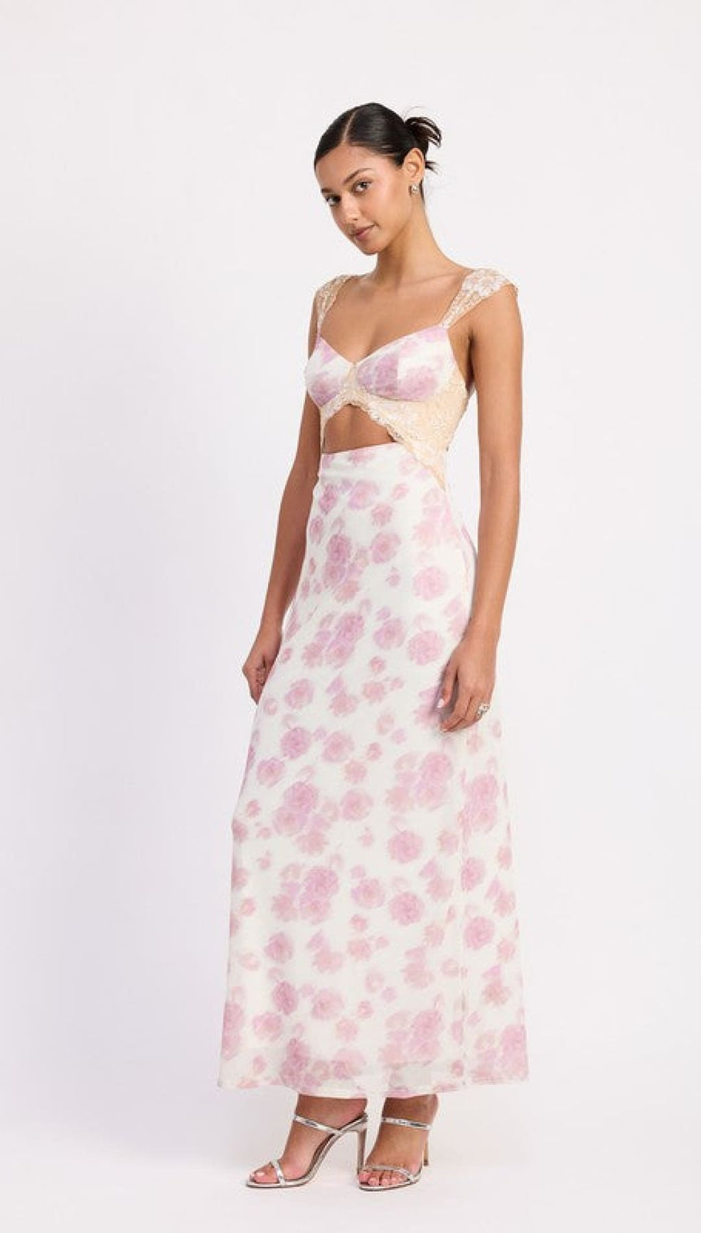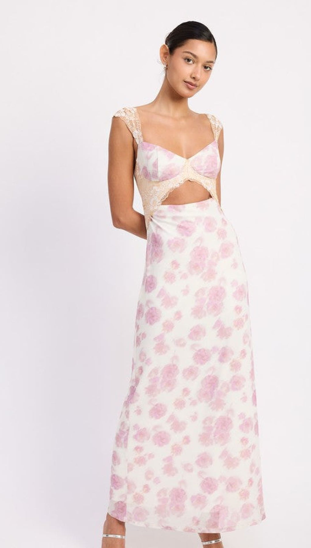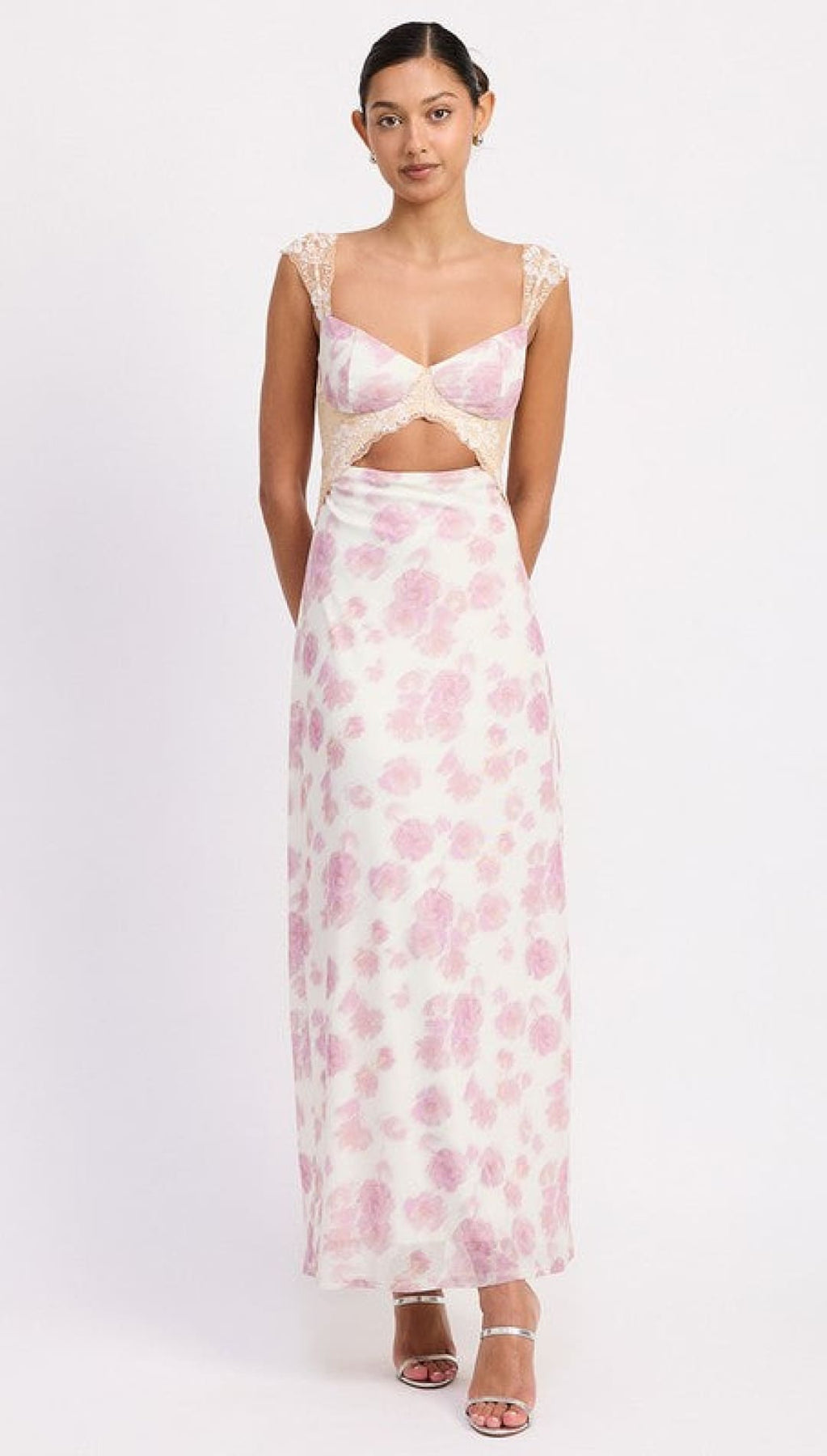 The Phoebe Lace Combo Maxi Dress brings vintage intimates charm to your wardrobe with its delicate floral print and intricate lace and mesh details. This maxi dress features a playful cutout on the bust, adding a flirty touch to its elegant silhouette. Perfectly versatile, it pairs effortlessly with boots for a casual vibe or heels for a night out. Crafted from a comfortable blend of polyester and spandex with a soft polyester lining, it moves with you while maintaining its shape. Model is 5'9" and wears a size small. Dress runs true to size.