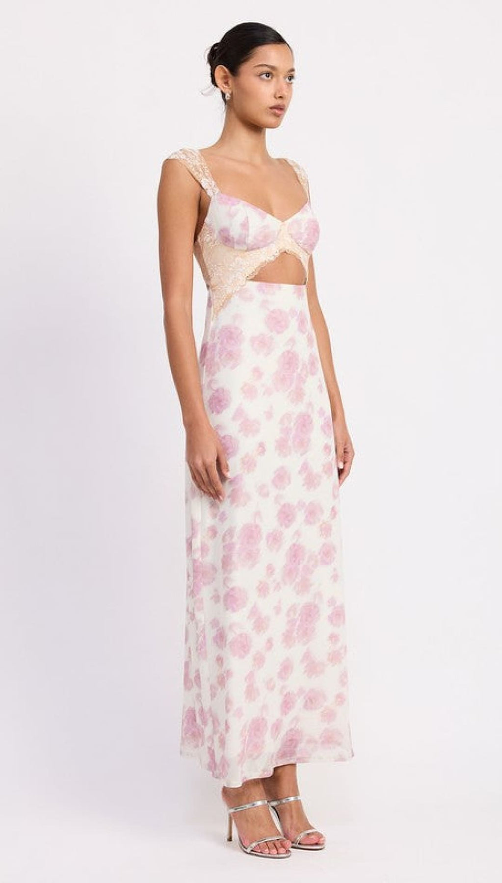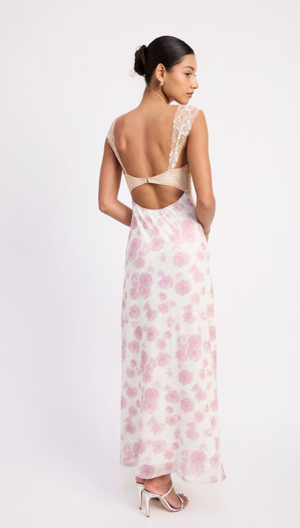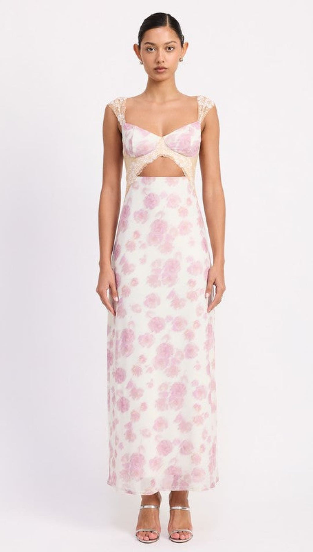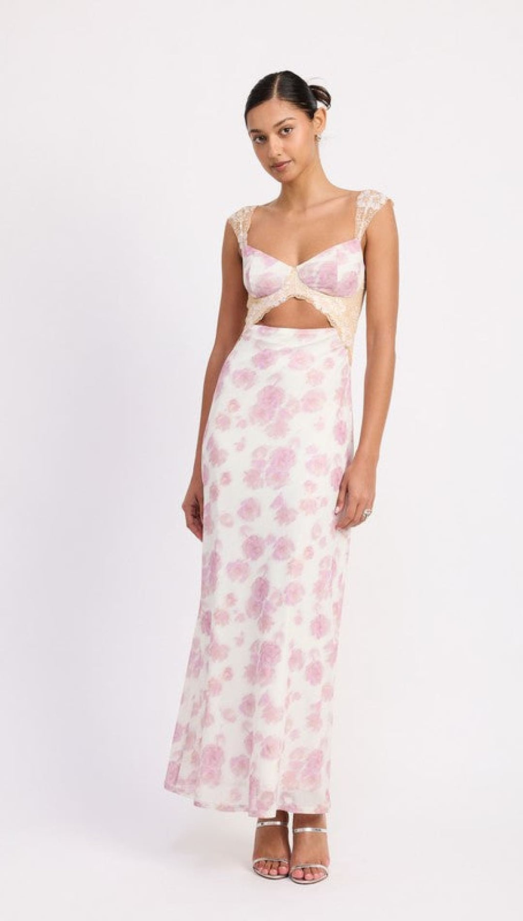 The Phoebe Lace Combo Maxi Dress brings vintage intimates charm to your wardrobe with its delicate floral print and intricate lace and mesh details. This maxi dress features a playful cutout on the bust, adding a flirty touch to its elegant silhouette. Perfectly versatile, it pairs effortlessly with boots for a casual vibe or heels for a night out. Crafted from a comfortable blend of polyester and spandex with a soft polyester lining, it moves with you while maintaining its shape. Model is 5'9" and wears a size small. Dress runs true to size.