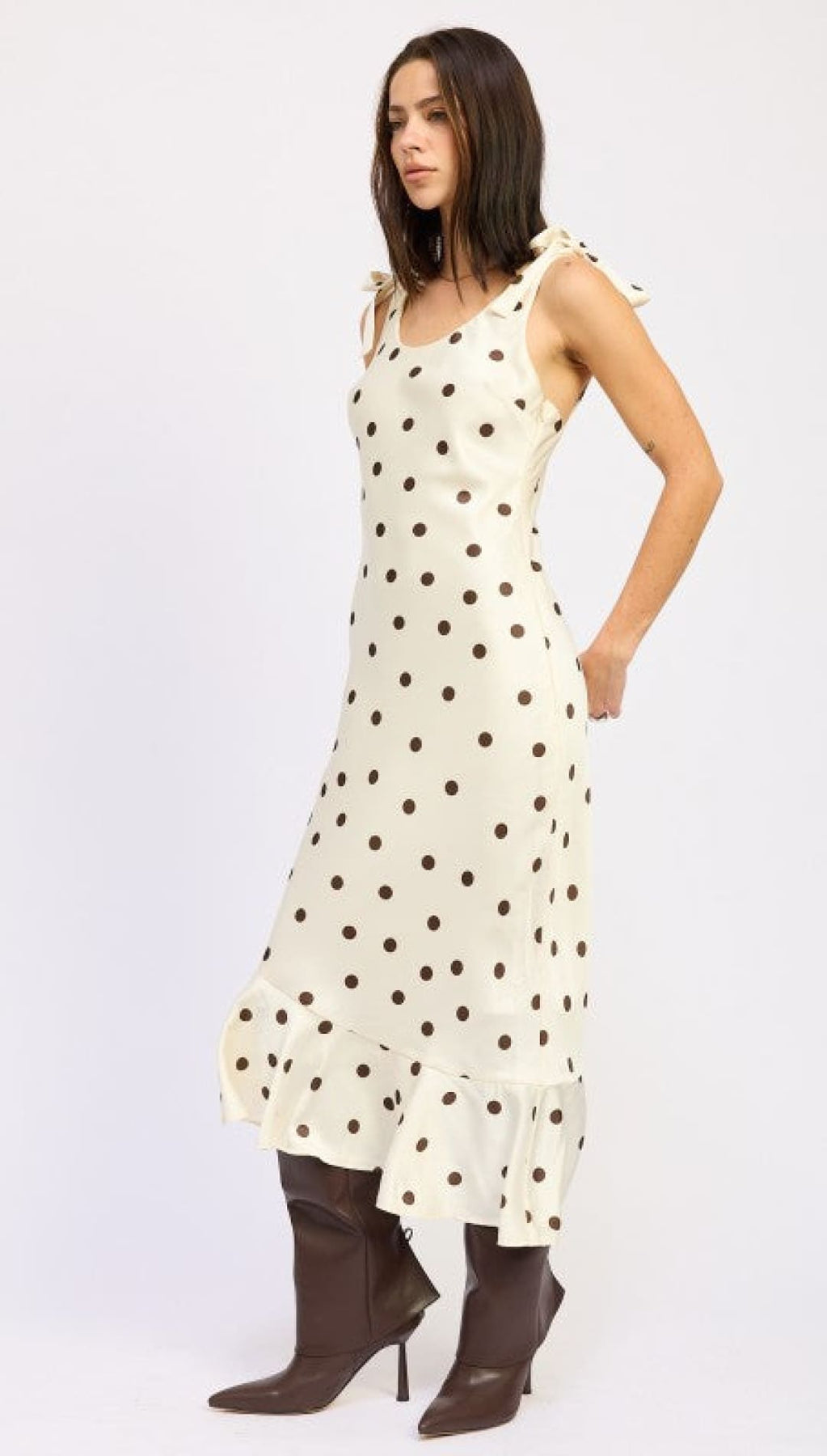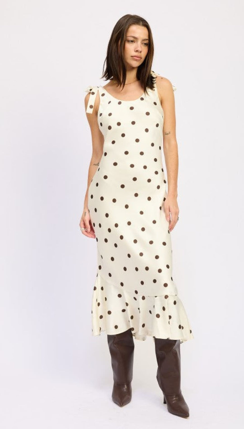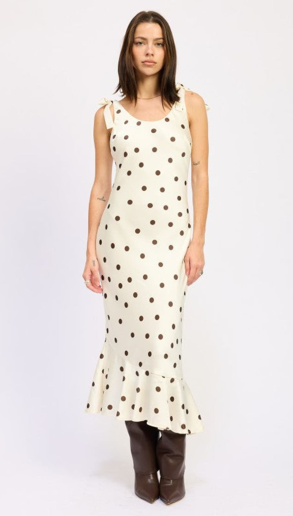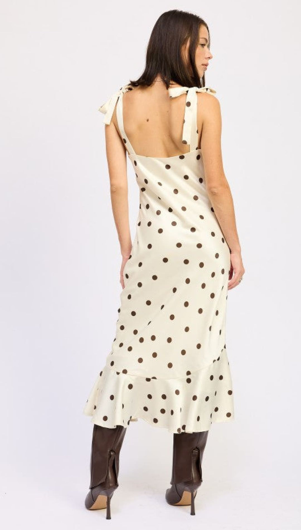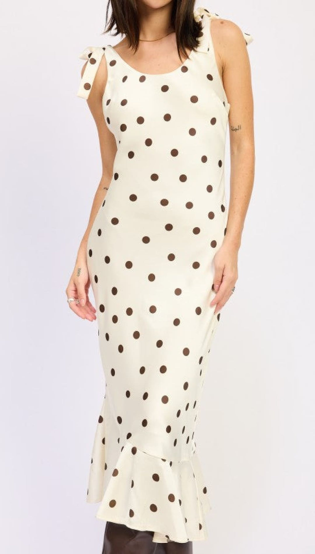 This fun polka dot maxi dress comes with cute shoulder ties for an extra playful vibe. The model is 5'9" and wears a size small. Made from 100% polyester with a polyester lining, this dress is both stylish and comfortable.