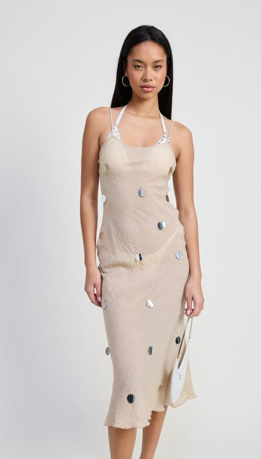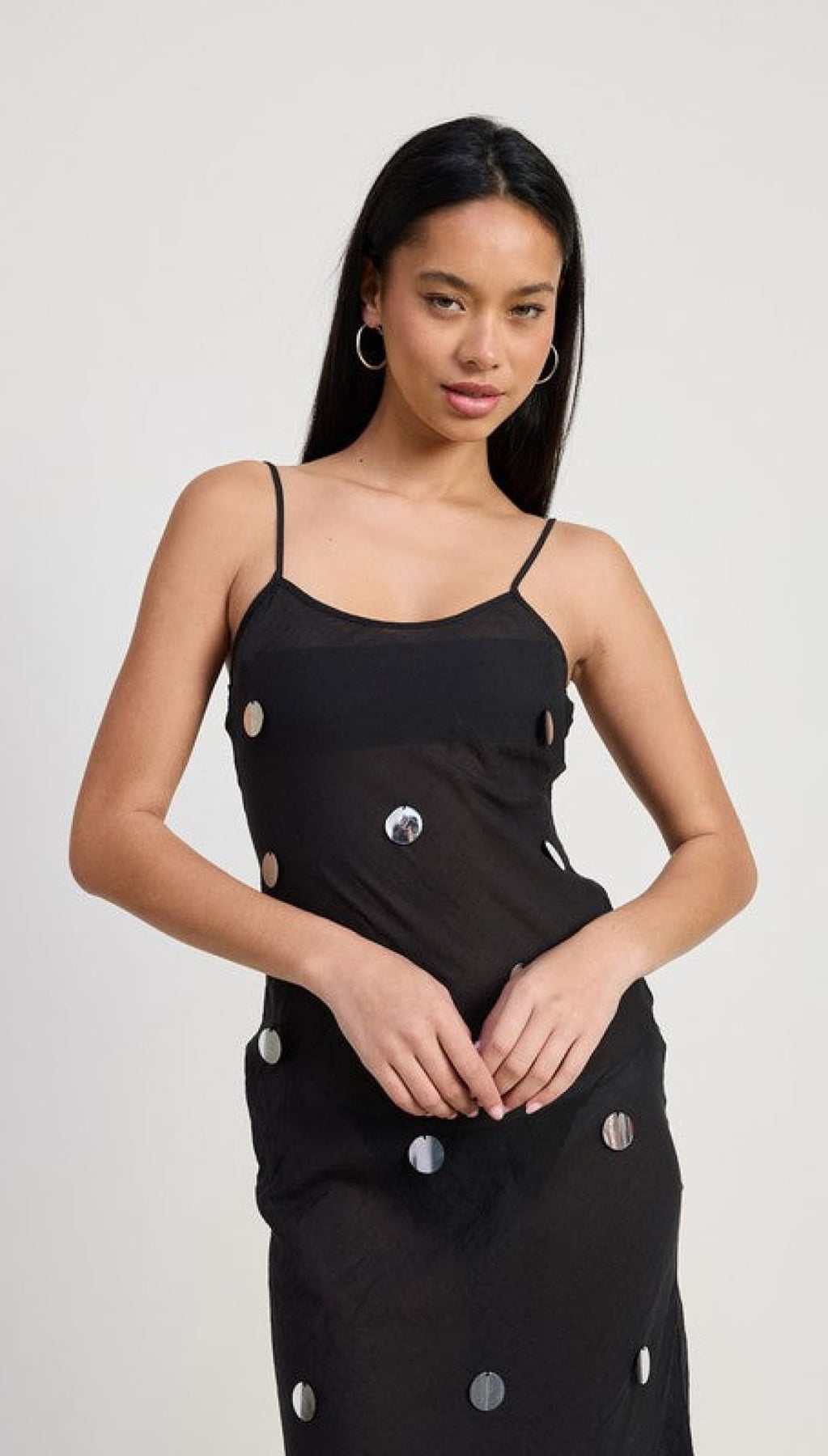 This festival-ready sheer cover-up dress shines with bold sequin embellishments. The model, standing 5'9", wears a size small for the perfect fit. Made from a comfy blend of 80% polyester and 20% cotton, this dress is your go-to for effortless, playful style.