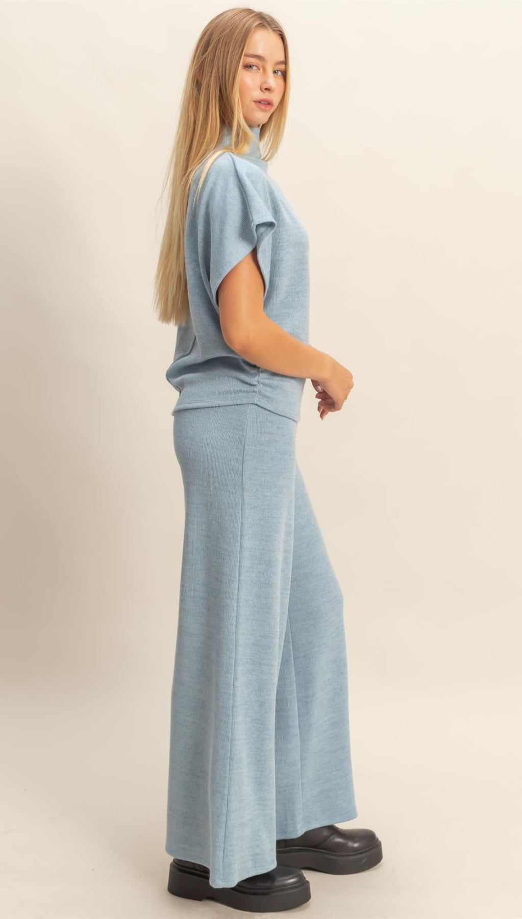Slip into the Benson Mock Neck Top, where cozy meets chic. Its super soft knit with a textured finish and relaxed fit keeps you comfy all day, while the cap sleeves add a flirty touch. Perfectly paired with matching wide-leg pants, this set flows with effortless style from casual daytime vibes to evening glam. Crafted for comfort, made to turn heads.
