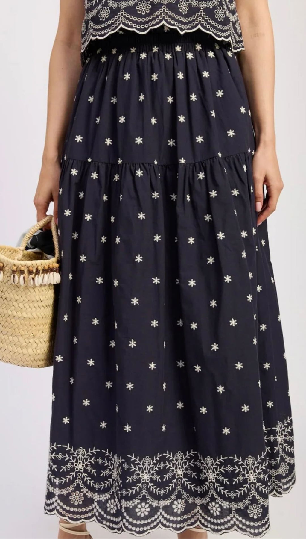 Effortlessly elegant, the Nara Maxi Skirt is a must-have in your wardrobe. This navy skirt features delicate white floral embroidery and a scalloped edge hem, adding a touch of femininity to any outfit. With pockets and an elastic waistband, it offers both style and practicality. Own the day with Nara!